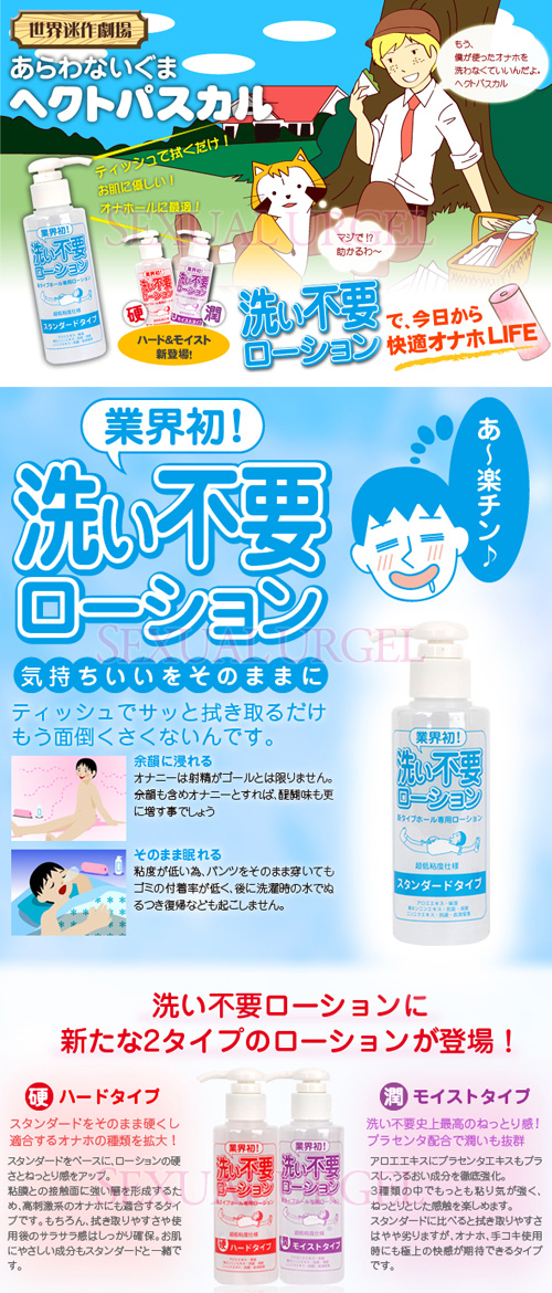 用完潤滑液和自慰套自爽後往往讓人想休息片刻(甚至想直接睡著)實在懶得再爬起身到浴室清洗擦拭。如果放任不去清洗往往會造成皮膚黏癢的衛生問題!現在您不用再煩惱這個問題了!超便利的免清洗潤滑液誕生囉!