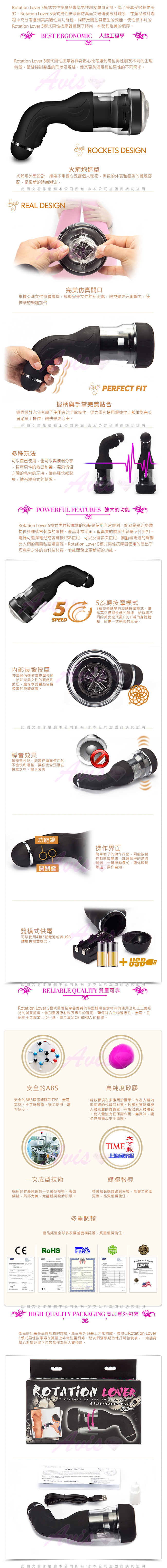 火箭炮超高速迴轉旋風機5模式旋轉男性按摩器專為男性朋友量身定制。為了使享受過程更美妙,按摩器仿真而突破傳統設計體系,在產品設計過程中充分考慮到其美觀性及功能性,同時更關注其產生的效能。使性感不凡的火箭炮5模式男性按摩器達到了時尚、神秘和唯美的境界。