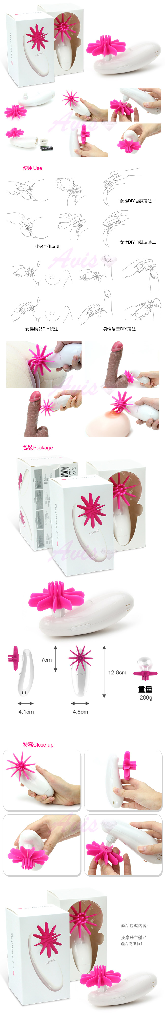 它的造型像小電風扇,一片片軟皮矽膠舌頭不停快轉,一片片地輪流舔擦著你的性器官。若舔到陰蒂或陰莖上,哪個女人或哪個男人不撩到慾火焚生,爽到只會呻吟?
