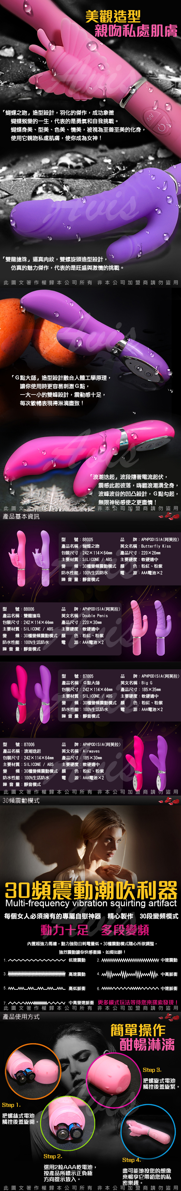 【蝴蝶之吻】造型設計,羽化的傑作,成功象徵,蝴蝶蛻變的一生,代表的是勇氣與自我挑戰,蝴蝶身美、型美、色美、情美,被視為至善至美的化身,使用它親吻你私處肌膚,使你成為女神