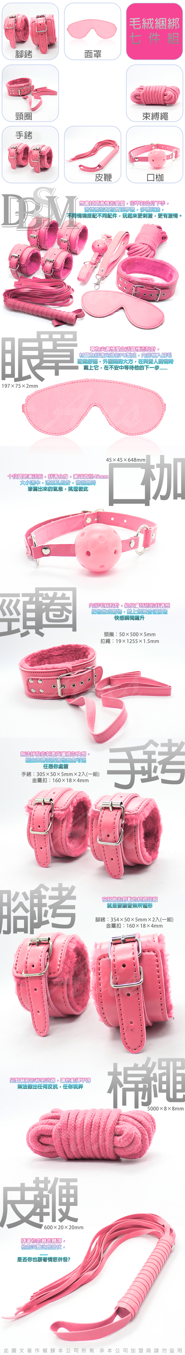 .商品內容:虐戀精品CICILY-束縛遊戲-眼罩手銬腳銬口枷頸圈皮鞭棉繩 七件套組 粉