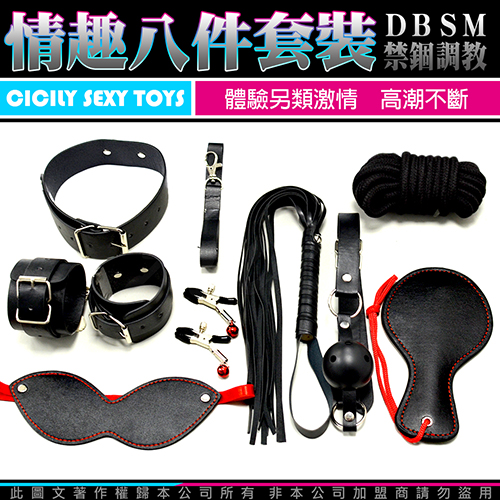 虐戀精品CICILY-控制遊戲 手銬、眼罩、皮拍、口塞、乳夾、繩子、鞭子、脖子套 八件組 黑