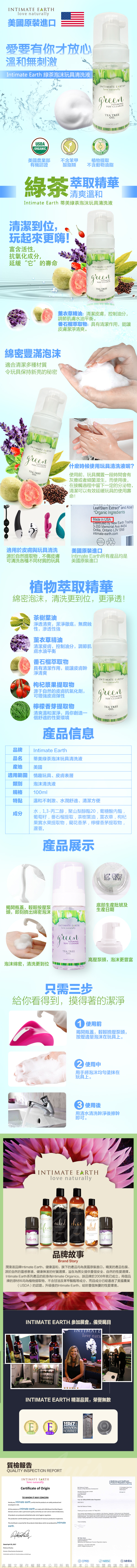.商品內容:美國Intimate-Earth Green 綠茶泡沫 玩具清潔液 100ml