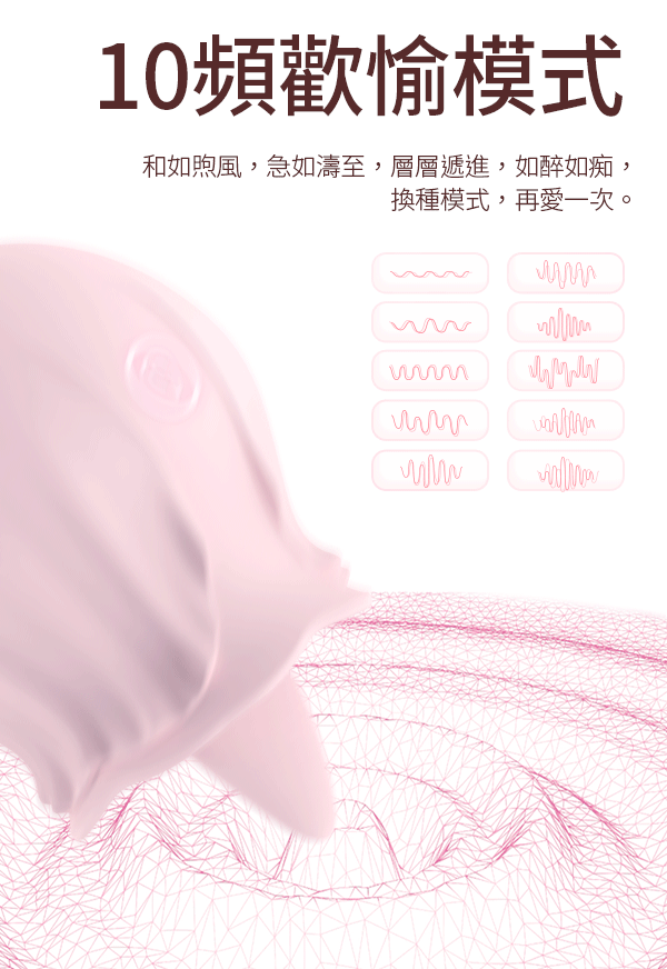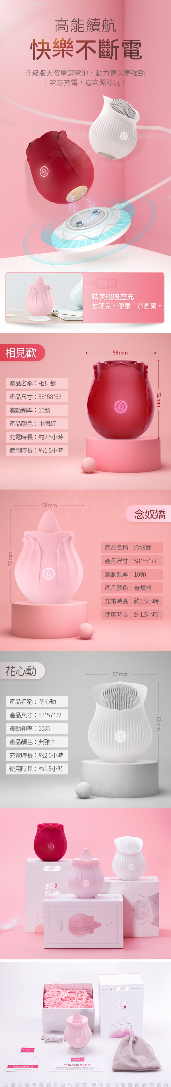 花非花系列迷你按摩器念奴嬌仿鬱金香造型的舌愛按摩器,花舌挑逗溫柔撩撥,調皮挑逗,有力拍打,直叫人大呼過癮!花瓣撩撥,四周花瓣還可包裹刺激外陰,內外同爽,欲罷不能!共10頻歡愉模式層層遞進,如醉如痴,讓您換種模式再愛一次。一體式矽膠全包裹細菌無殘留,用後易清洗。嚴密防水設計,可在水中任意姿勢長時間享受。