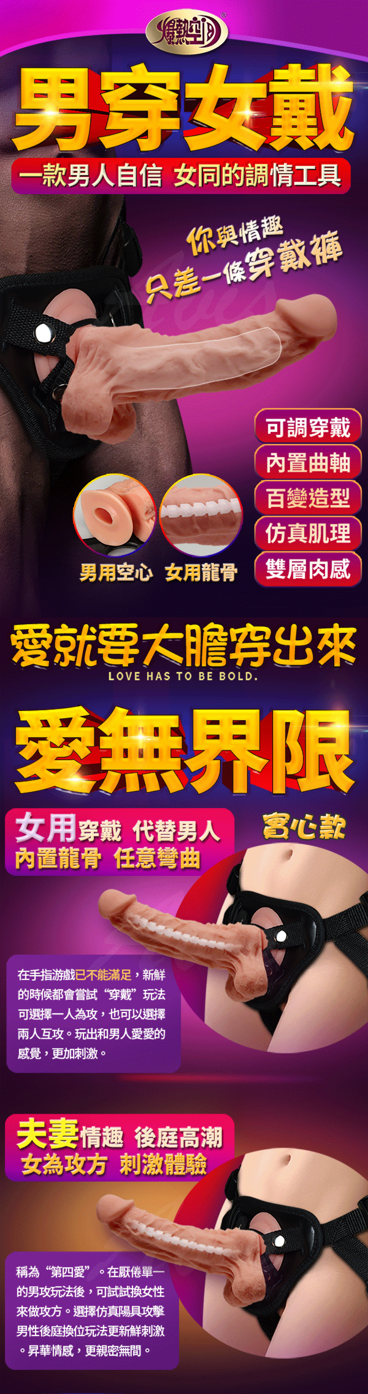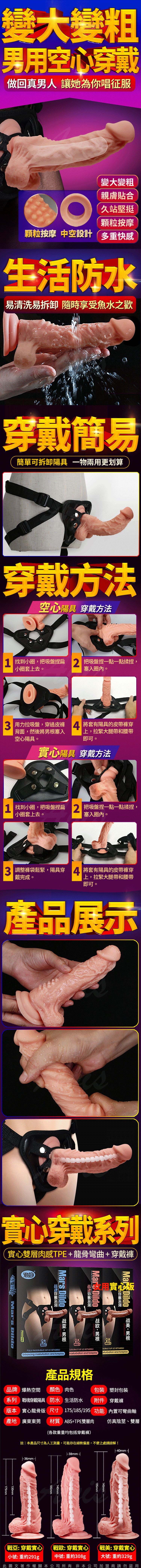戰魂穿戴褲讓您從此回復男人雄風,在另一半面前更有自信與自尊,擬真的雙層材質肉感大老二軟中帶硬,超擬真外型與前端實心龜頭,內置龍骨讓您可以自由彎曲任何您想要的角度直攻敏感點!!免提吸盤可強力吸附讓您不管在哪都能愛~而卡扣設計的腰帶方便穿脫,把大老二穿戴在身上,瞬間變身成大男根讓您帶著它一起衝鋒陷陣