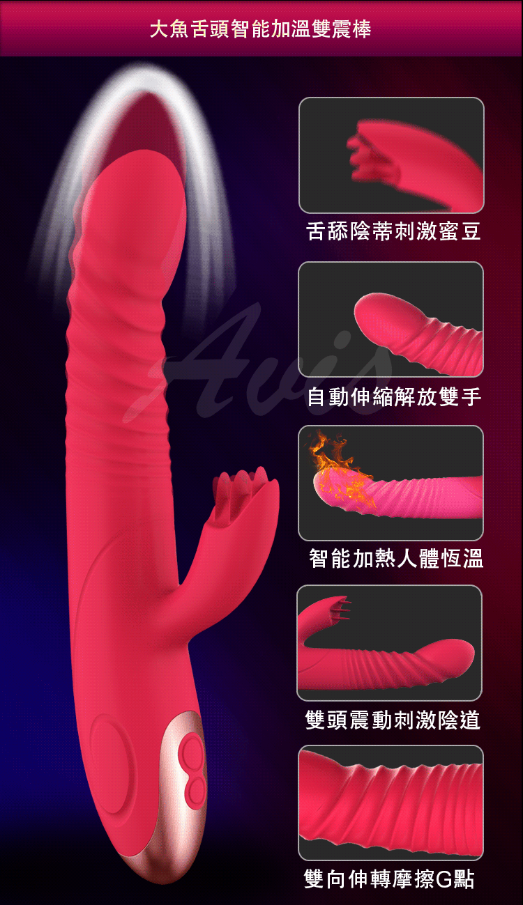 大魚系列舌頭版為擁有一棒多用功能全面再升級!!強勁8段變頻震動搭配7頻自動伸縮功能雙面迎擊,讓您淫水源源不絕攪動您的花心。符合女性私密結構設計更緊密的貼合,在抽插的碰撞G點同時仿舌舔弄您的蜜豆讓您感受連環性全身抽搐快感。還擁有貼心智能加溫功能讓您擺脫冰冷,體驗如真人般的體溫喔~採用一體設計防水功能讓您清洗方便使用愉快