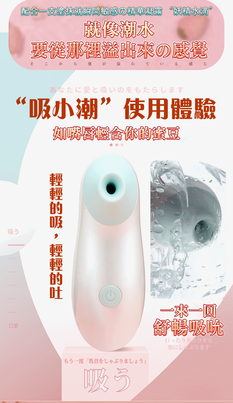 吸小潮吮吸器,撩撥您身上所有敏感部位不管是耳垂、咪咪或是蜜豆都能輕鬆刺激到!!!擁有3速+7種波段吸吮每一種模式都能帶給您不同的感受喔~此款造型可愛小巧便攜,吸小潮將是您外出時的不二選擇高潮