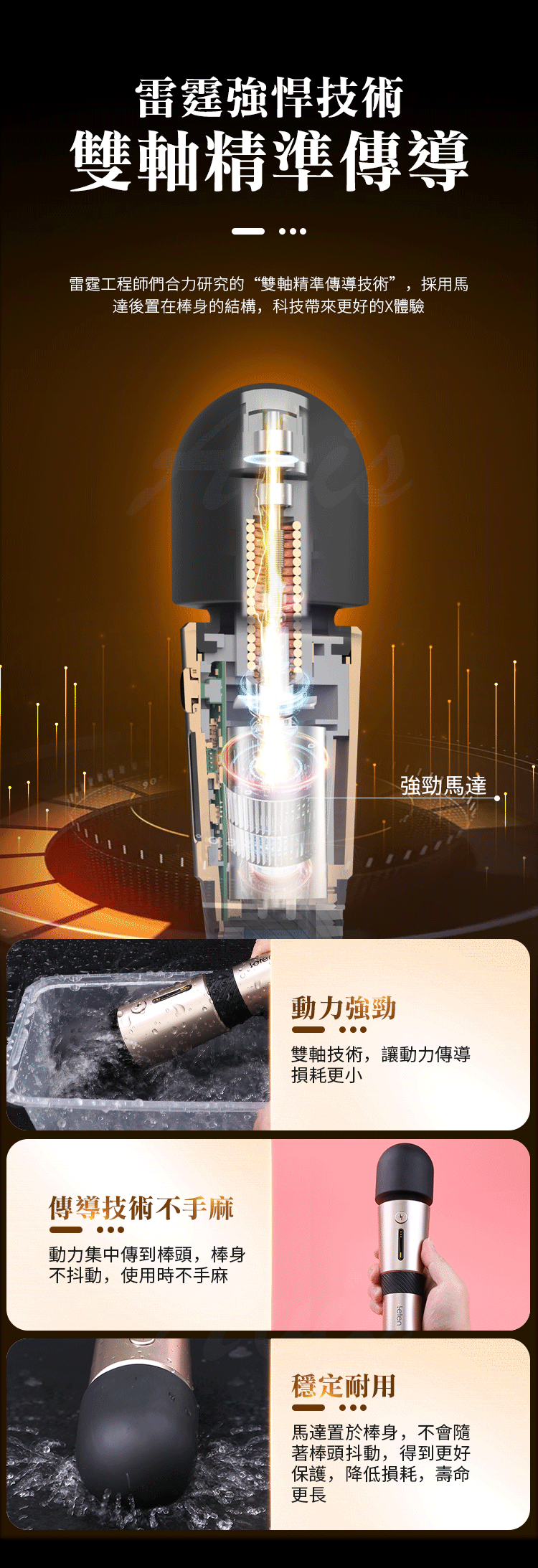 馬達置於棒身,不會隨著棒頭抖動,得到更好保護,降低損耗,壽命更長