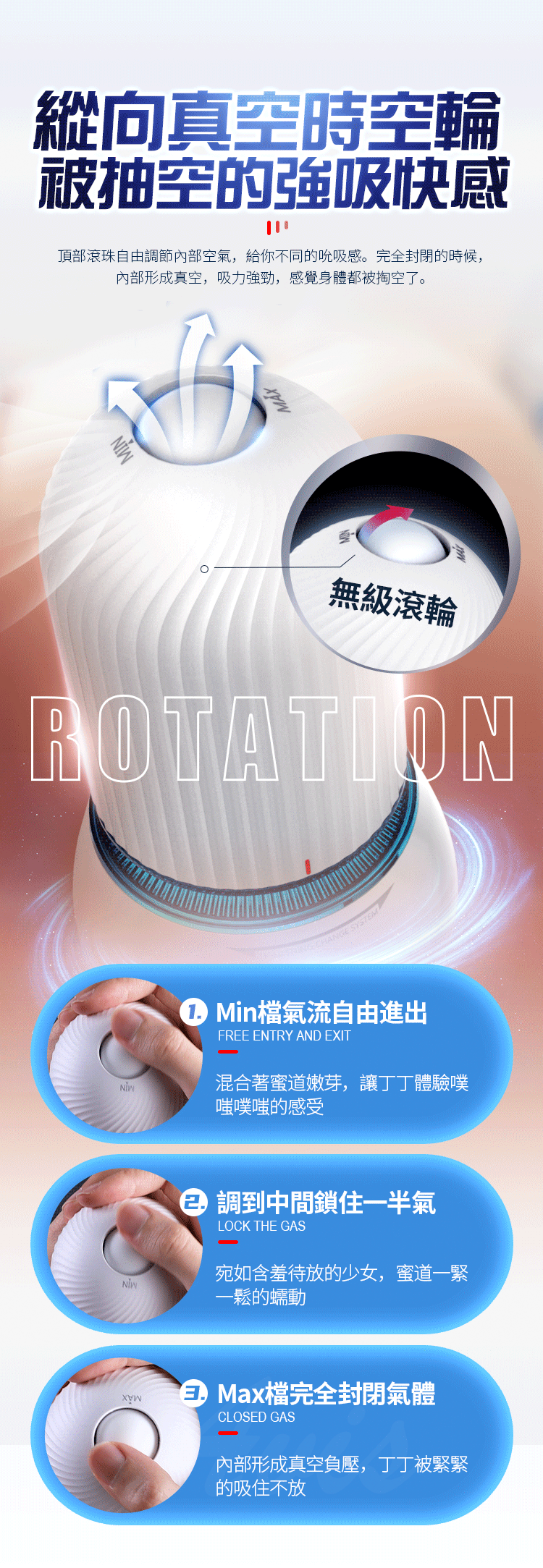 時空扭轉飛機杯旋轉+氣控吮吸榨精雙快感,時空扭轉杯的雙輪設計,無級調節內部緊度與氣壓,同時享受空氣吸吮,與縮陰壓榨的雙重快感。