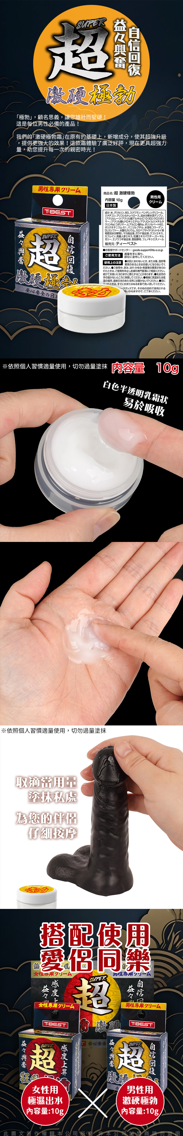我們的「激硬極勃霜」在原有的基礎上,新增成分,使其超強升級,提供更強大的效果!這款霜體驗了廣泛好評,現在更具超強力量,助您提升每一次的親密時光!