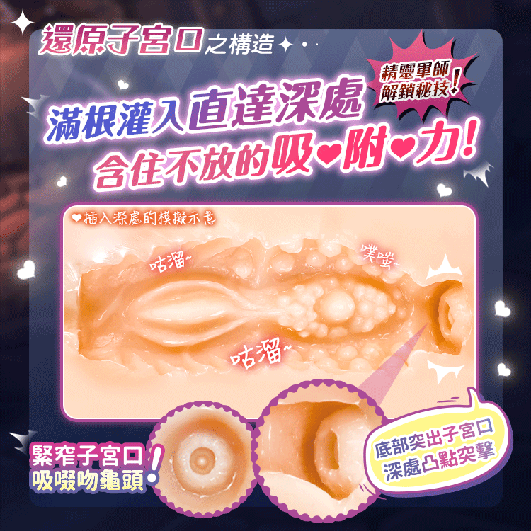 真實感體驗:還原子宮口構造,搭配緊密腔道設計,帶來滿根灌入的深層刺激。