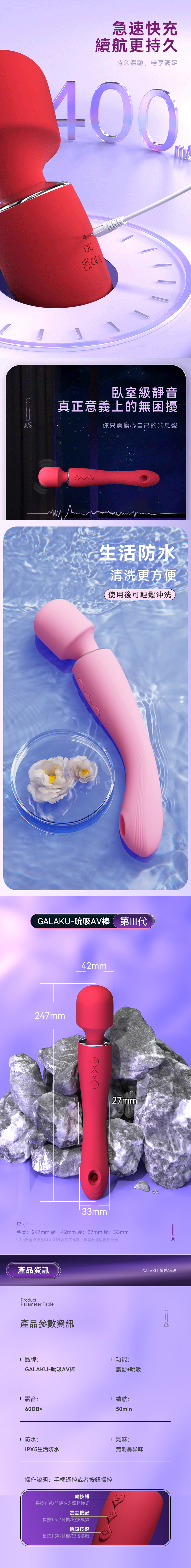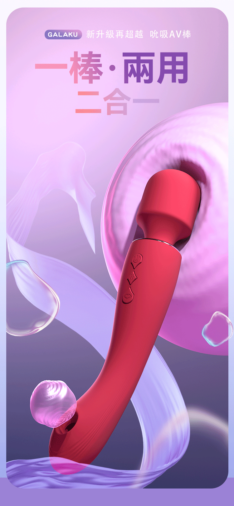 GALAKU 皇后AV按摩棒完美結合吸吮與震動功能,雙頭切換隨心所欲。一端是高效震顫的AV按摩棒,另一端則是精準吸吮的G點神器,讓你一次擁有雙重滿足,輕鬆探索不同層次的快感。