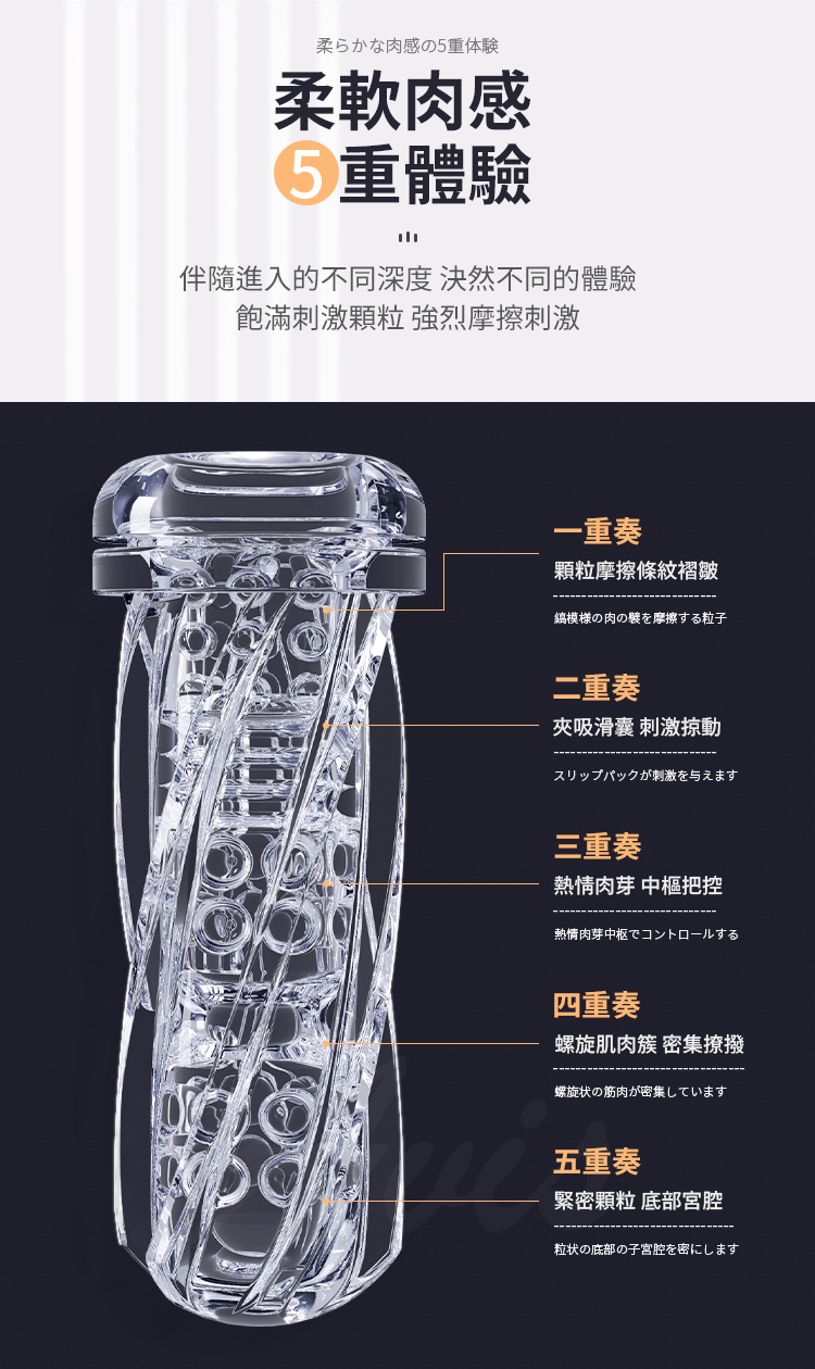 螺旋緊緻設計:全新螺旋緊緻結構,五重體驗全面包覆,帶來從外到內的層層壓迫感,讓每一個細節都滿足您對快感的渴望。