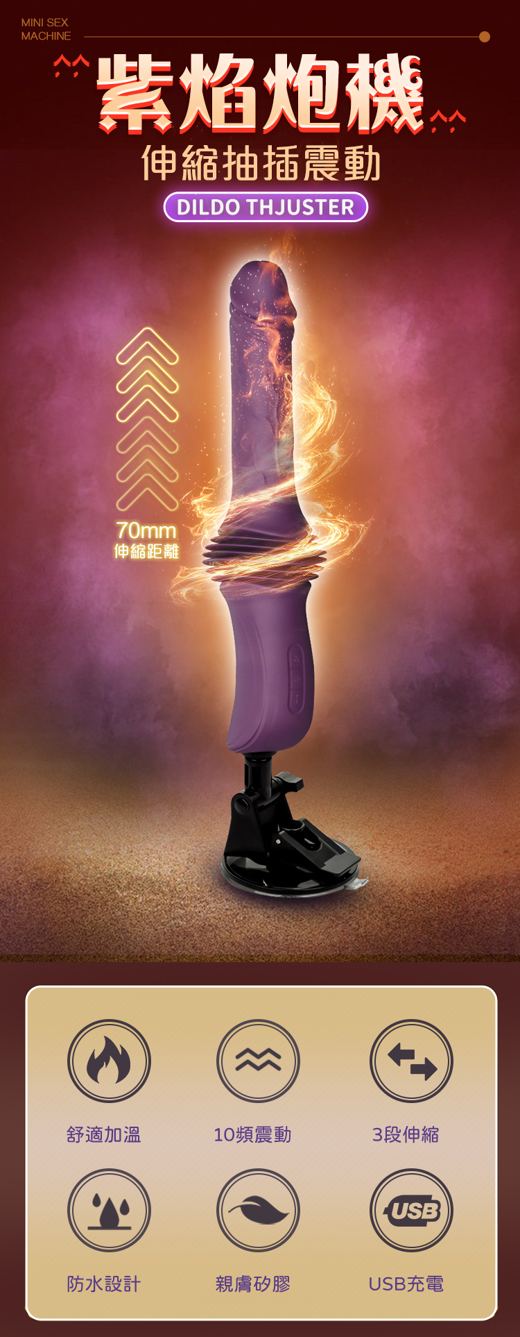 以「力量 × 節奏 × 深度」為核心打造的紫焰炮機,透過 70mm 大幅度伸縮,模擬真實深入的推進感,結合 10 段震動與溫熱功能,讓節奏、力量與體感一次到位。